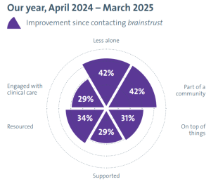 While we are still having a positive impact and improving well-being across all six indicators, we have work to do to ensure those who would benefit from our support are able to access us when they need it most. This reinforces the need for strong clinical engagement and making sure brainstrust is accessible, available and a known option for all patients at every point of their pathway.