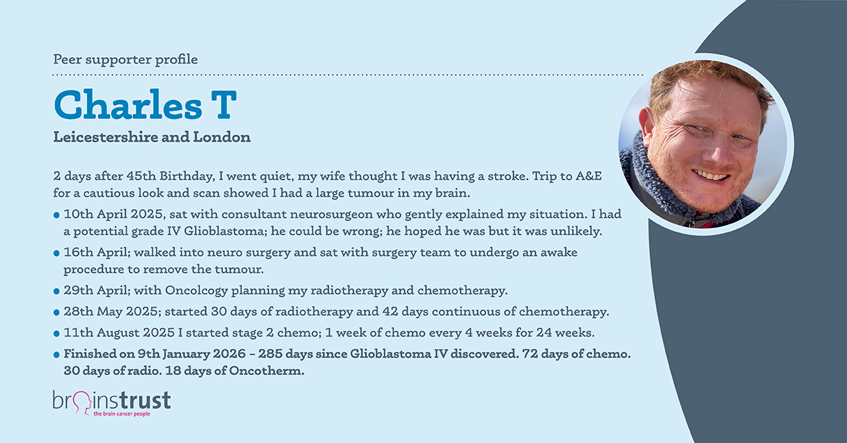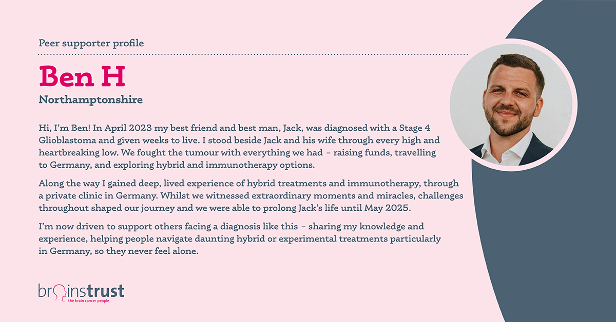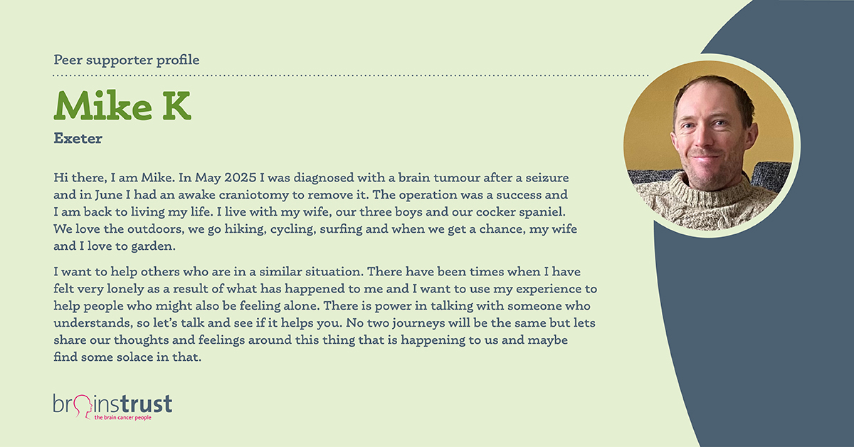 At brainstrust, we don’t underestimate the value of connecting with someone who has been where you are now and had similar experiences. Our community overwhelmingly reports that a brain tumour diagnosis is frightening, isolating and bewildering. Talking to someone who has been through a similar experience can help to reduce feelings of isolation, reduce fear of the unknown and help you to make sense of what is happening.