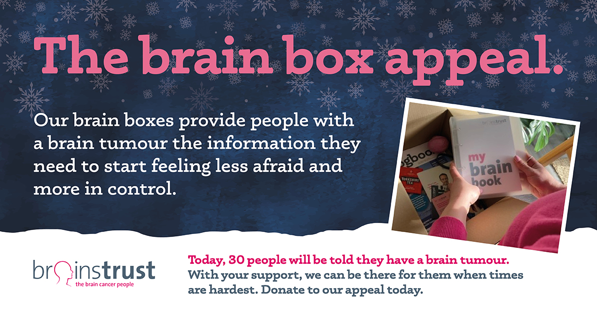 Tailored to each individual, the brain box makes sure people have the information and tools they need to feel in control and ready to face the road ahead. Without it, people with a brain tumour and their loved ones face their brain tumour journey without the resources to make the decisions that are right for them. Find out more about our impact here.