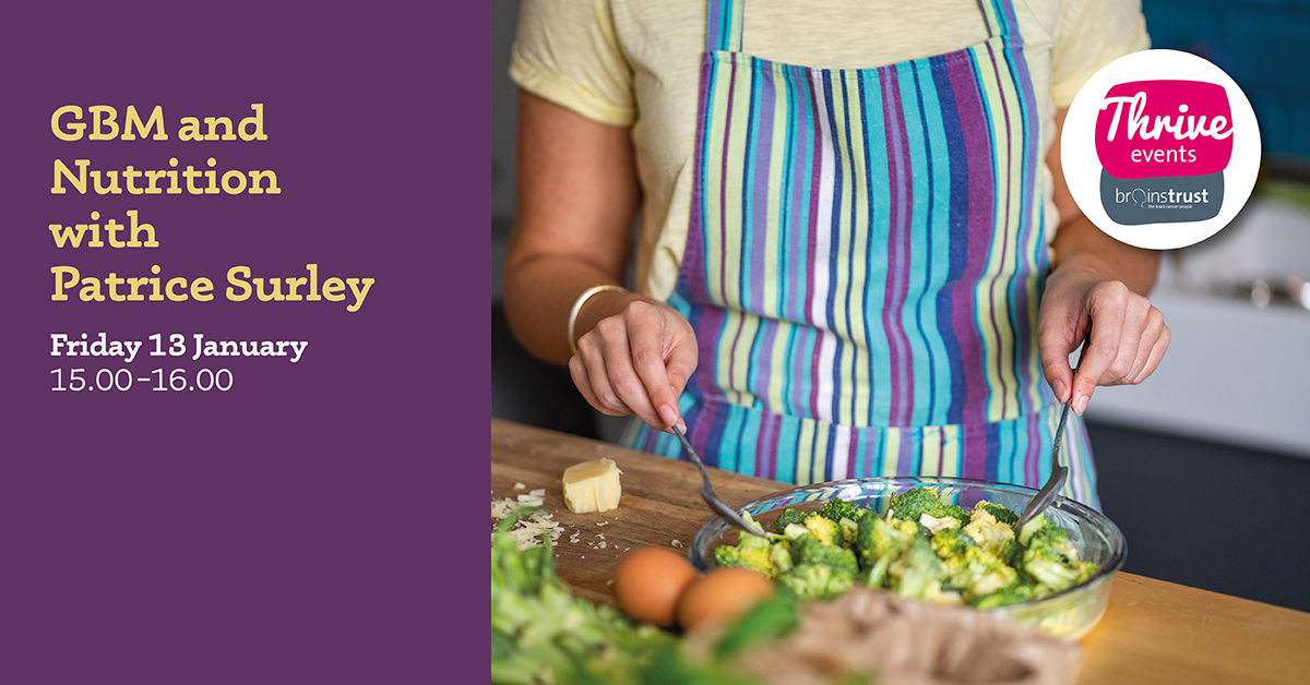 Patirce Surley is doing a return visit! Following a very successful webinar for us, Patrice has kindly offered to come back to chat about nutrition based on her experience with GBM patients. There will be an opportunity to join in a Q & A with Patrice so if you’ve any burning questions, Patrice is here to answer them.