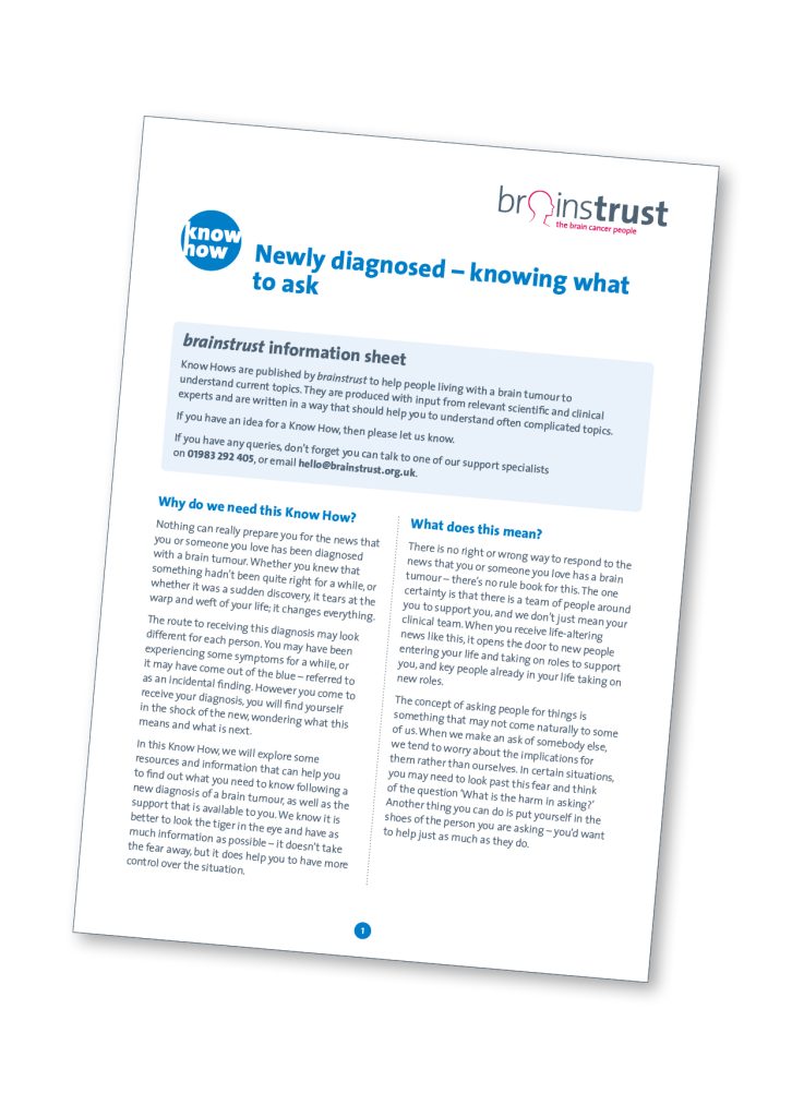 In this Know How, we will explore some resources and information that can help you to find out what you need to know following a new diagnosis of a brain tumour and the support that is available to you.