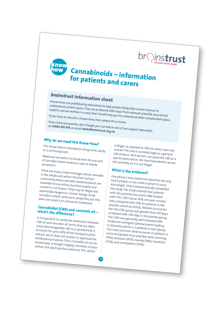 This Know How is intended to bring some clarity to a confusing topic. Medicinal cannabis is a broad term for any sort of cannabis-based medicine used to relieve symptoms. There are many mixed messages about cannabis in the media and within the brain tumour community. Many cannabis based products are available to buy online, but their quality and content is not known. They may be illegal and potentially dangerous. Certain things inside cannabis contain anticancer properties, but this does not make it an anticancer treatment.