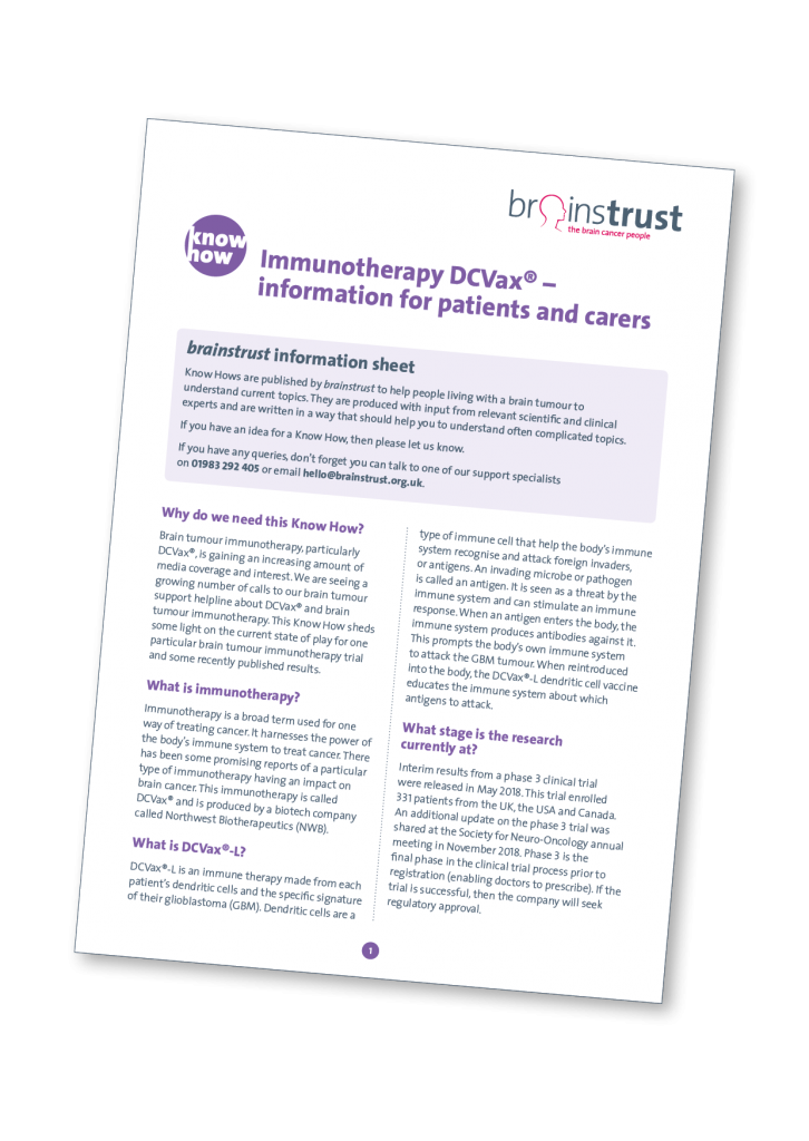 Brain tumour immunotherapy, particularly DCVax®, is gaining an increasing amount of media coverage and interest. We are seeing a growing number of calls to our support helpline about DCVax® and brain tumour immunotherapy. This Know How sheds some light on the current state of play for one particular brain tumour immunotherapy trial and some recently published results.