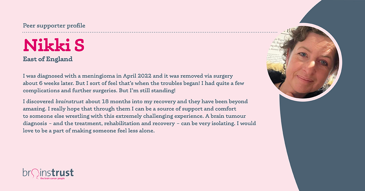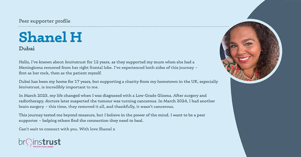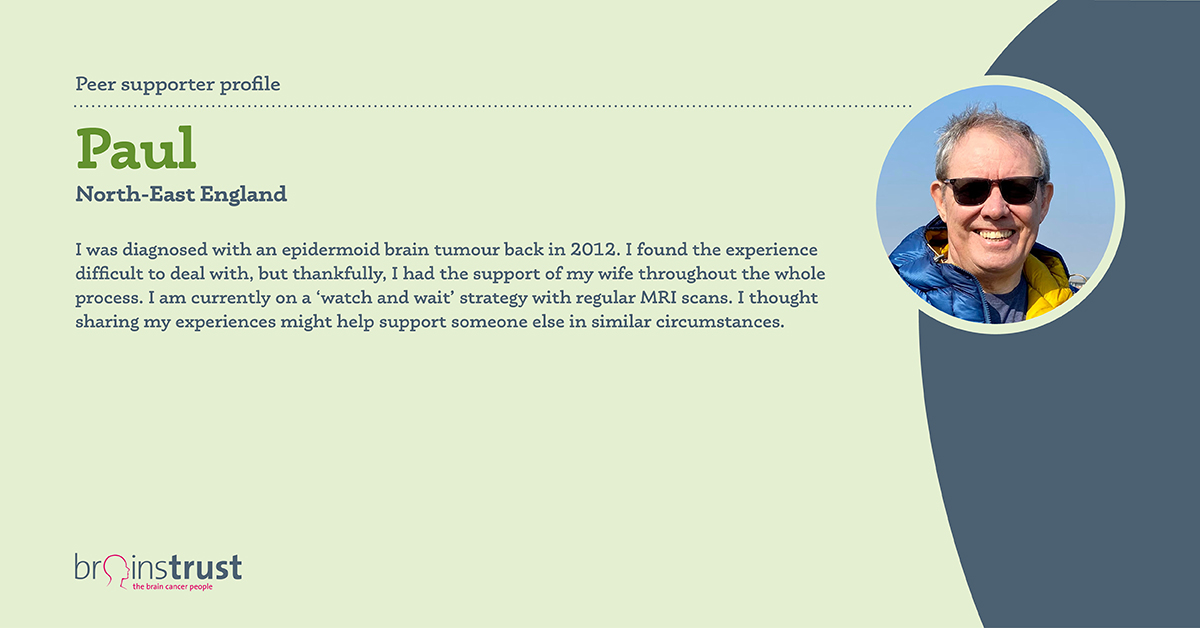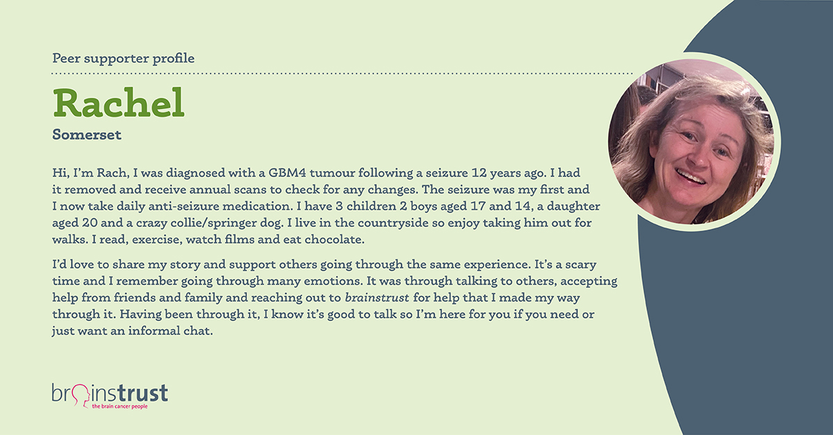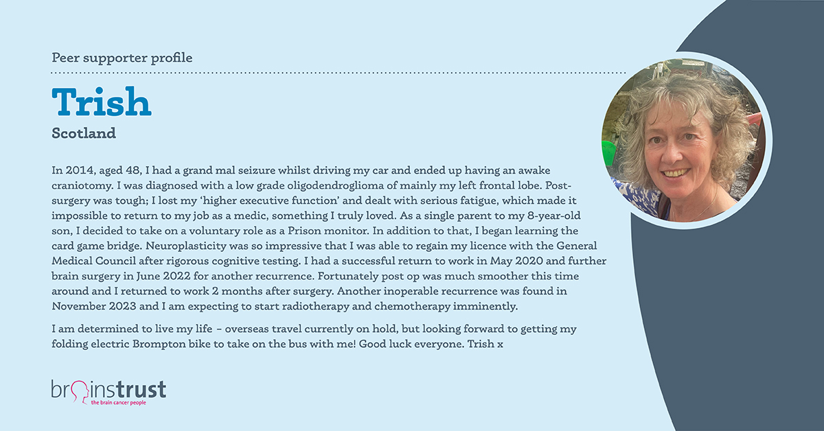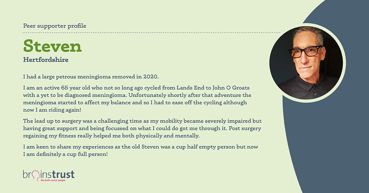 At brainstrust, we don’t underestimate the value of connecting with someone who has been where you are now and had similar experiences. Our community overwhelmingly reports that a brain tumour diagnosis is frightening, isolating and bewildering. Talking to someone who has been through a similar experience can help to reduce feelings of isolation, reduce fear of the unknown and help you to make sense of what is happening.