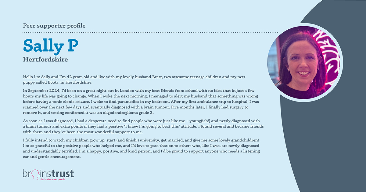 The aim of our peer support service is to directly connect you with one of our brilliant volunteer peer supporters, to help you to feel better understood and supported. Our peer supporters have a wide range of lived experiences and have all been impacted by a brain tumour diagnosis. Some have been diagnosed with a brain tumour themselves and others have supported a loved one with a diagnosis.