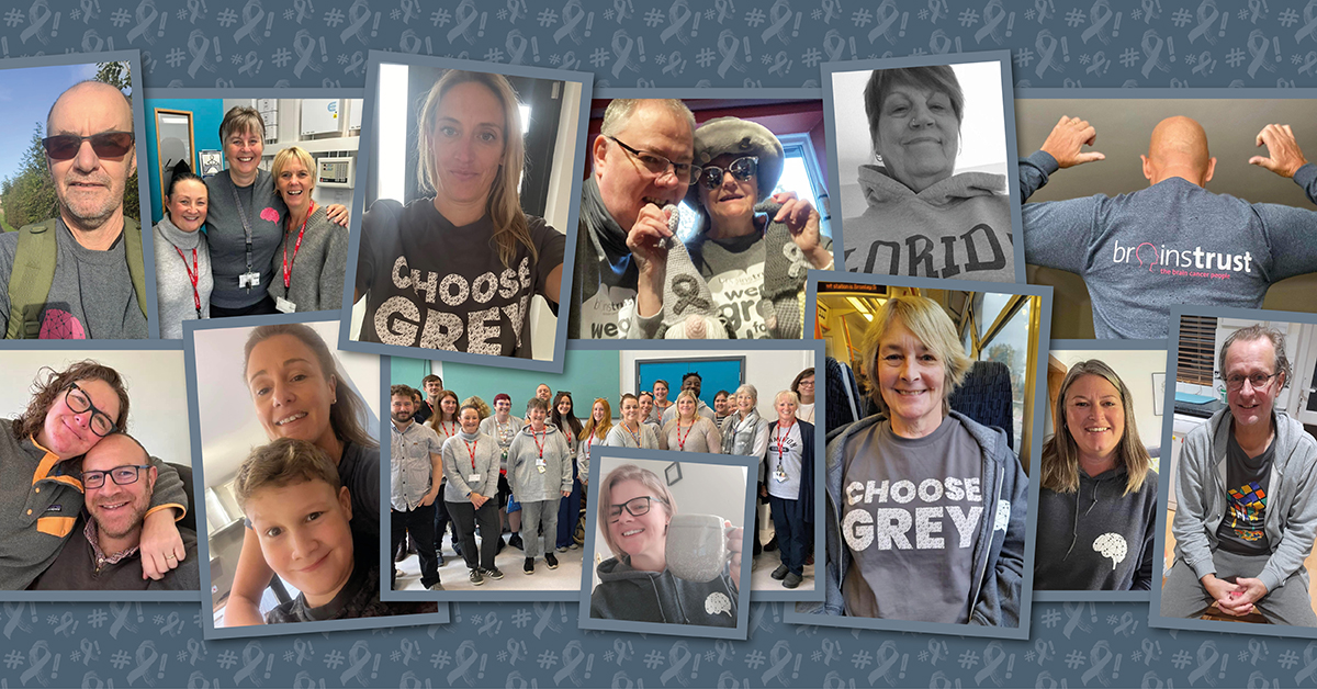 Over the years this campaign has reached over 1 million people and has raised tens of thousands of pounds for brainstrust’s work. This is because it is easy to join in.  Help us reach more people with vital coaching and support, and help the world understand what people with a brain tumour is up against – simply pick a day between the 25th of October and the 1st of November, choose something grey to wear, and let people know why you chose grey.  We also encourage you to make a small donation online to brainstrust, or to our Wear Grey Just Giving page. Don’t forget to share your day in grey on your socials and use #brainstrust #weargrey
