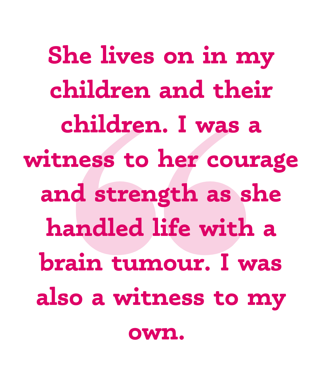 She is the greatest human I’ve ever known. I am honoured to have been this woman’s husband, and to have been allowed to share thirty-six years of our life together. She lives on in my children and their children. I was a witness to her courage and strength as she handled life with a brain tumour. I was also a witness to my own.