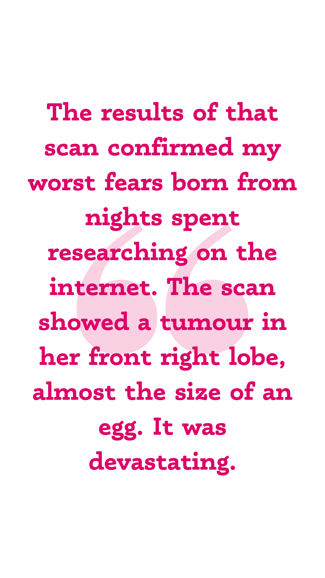The results of that scan confirmed my worst fears born from nights spent researching on the internet. The scan showed a tumour in her front right lobe, almost the size of an egg. It was devastating.