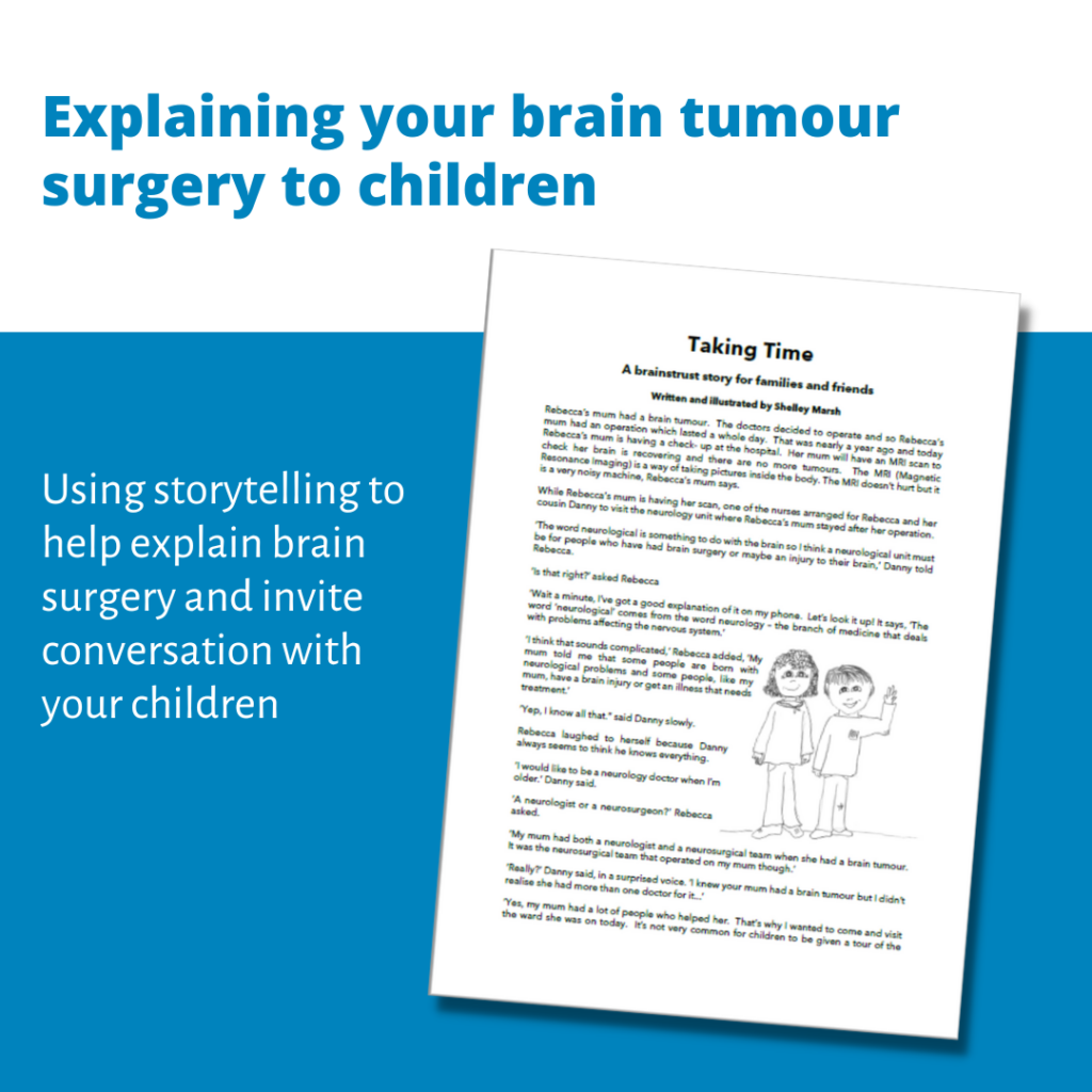 Shelley, a member of the brainstrust community, has drawn on her own experience of being diagnosed with a meningioma, as well as her professional experience in education, to create a resource designed for parents who need to explain their brain tumour surgery to their children. Shelley has spoken to us about why she created this resource and how she hopes it will help families. You can download the resource.