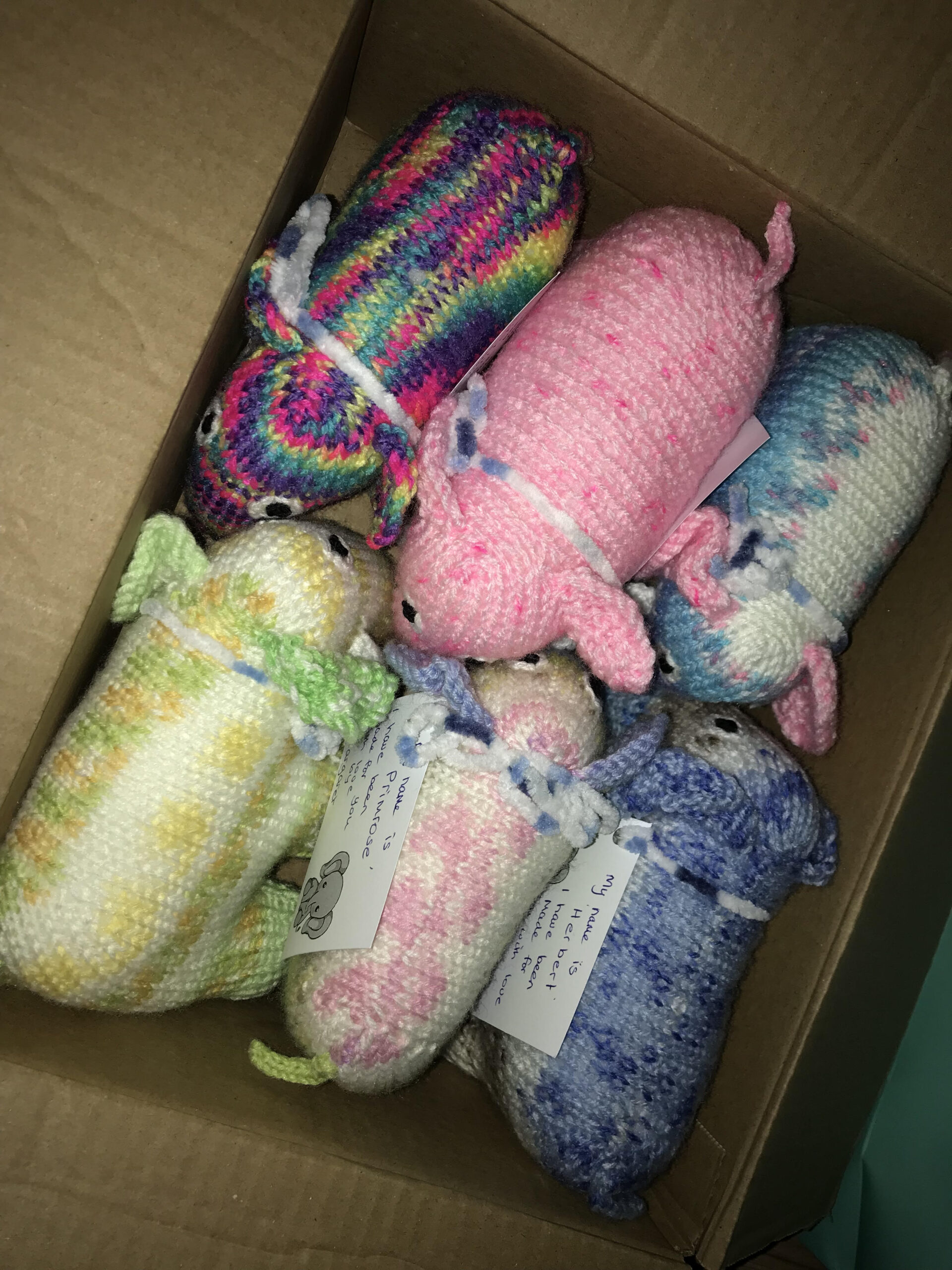 Thank you to everybody who knitted an elephant. They have arrived at our little Isle of Wight office from all over the UK, along with beautiful messages to pass on with them.