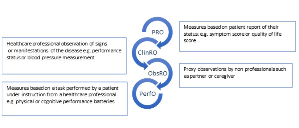 Patient Reported Outcomes (PROs) are measures which are directly reported by patients and which reflect their personal experience of their disease and its treatment. They constitute one component of a group of patient focused measures collectively termed Clinical Outcome Assessments (COAs). Clinician Reported Outcome (ClinRO) measures, Observer Reported Outcome (ObsRO) measures and Performance Outcome (PerfO) measures are others (see figure 1). Use of PROs allows assessment of trade-offs between tumour responses and effects on patients.