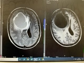 Eventually I had an MRI and a cyst was found on my brain, it was causing pressure so they admitted me with a view to operating the following week. However, over the weekend I deteriorated and had to have an emergency craniotomy in the early hours of the May bank holiday. My brilliant neurosurgeon literally saved my life by draining a very large cyst on my brain. This was then followed up with a 2nd craniotomy 3 weeks later to have as much as could safely be removed of the tumour that had been underlying the cyst.